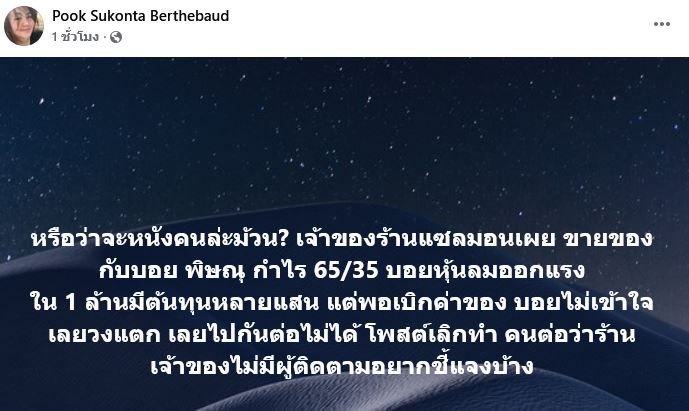 "หรือว่าจะหนังคนล่ะม้วน ? เจ้าของร้านแซลมอนเผย ขายของกับบอย พิษณุ กำไร 65/35 บอยหุ้นลมออกแรง ใน 1 ล้านมีต้นทุนหลายแสน แต่พอเบิกค่าของ บอยไม่เข้าใจเลยวงแตก เลยไปกันต่อไม่ได้ โพสต์เลิกทำ คนต่อว่าร้าน เจ้าของไม่มีผู้ติดตามอยากชี้แจงบ้าง"