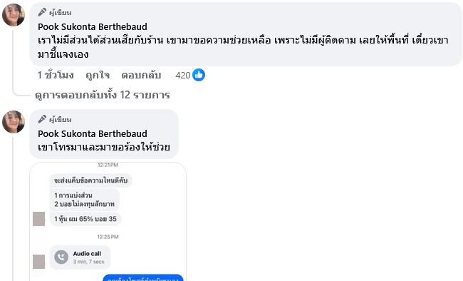 ต่อมา เจ้าของร้านได้เข้ามาคอมเมนต์ใต้โพสต์ดังกล่าว ชี้แจงเป็นข้อ ๆ ยืนยันว่า ตัวเองเป็นเจ้าของออกทุน 100% และแบ่งหุ้น 35% เงินขายทุกบาทโอนเข้าบอย มีการเบิกตามความจริงและมีหลักฐานชัดเจน แต่ฝั่งบอยไม่รายงานยอดขายต่อวัน ซึ่งตัวเองเป็นคนบอกเลิกการขายนี้เอง แม้ขายดีหลักล้าน