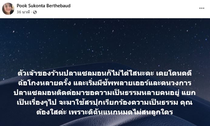 "ตัวเจ้าของร้านปลาแซลมอนก็ไม่ได้ใสนะคะ เคยโดนคดีฉ้อโกงหลายครั้ง และเริ่มมีซัพพลายเออร์และคนวงการปลาแซลมอนติดต่อมาขอความเป็นธรรมหลายคนอยู่ แยกเป็นเรื่อง ๆ ไป จะมาใช้สรปุกเรียกร้องความเป็นธรรม คุณต้องใสค่ะ เพราะดิฉันแหกหมดไม่สนลูกใคร"