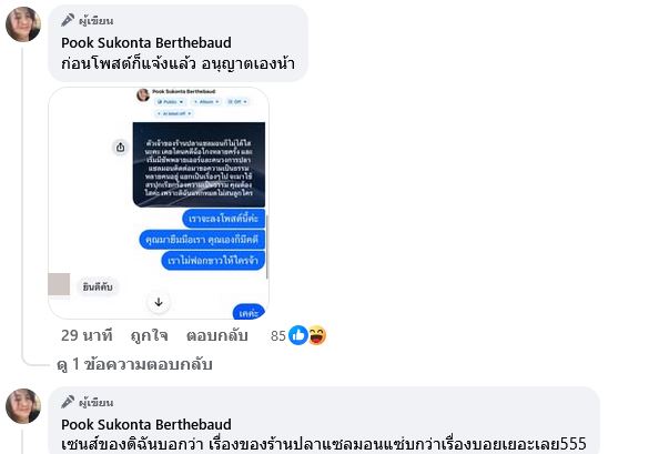 ล่าสุด (2 สิงหาคม 2568) ในเฟซบุ๊ก Pook Sukonta Berthebaud ซึ่งเป็นของ สรปุก คนดังในสื่อสังคมออนไลน์ ได้ออกมาเคลื่อนไหล โพสต์ถึงประเด็นดังกล่าวว่า เปิดตัวว่าหรือจะเป็นหนังคนละม้วน หลังเจ้าของร้านแซลมอน ออกมาแจงโต้กลับ บอย ภิษณุ ในอีกมุม