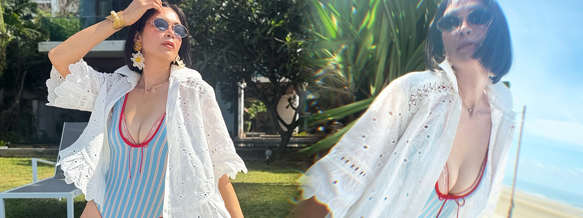 ในเซตภาพดังกล่าว เมย์ มาริษา มาในลุควันพักผ่อนริมทะเล สวมชุดว่ายน้ำวันพีซลายทางสีฟ้าสลับขาวสุดเก๋ ที่ออกแบบมาเพื่ออวดสัดส่วนเว้าโค้งอย่างลงตัว โดยเฉพาะช่วงหน้าอกที่ผูกโบว์สีแดงเพิ่มความน่ารักแต่แฝงความร้อนแรงไว้อย่างเต็มเปี่ยม