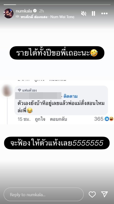 ก่อนที่ล่าสุด (20 สิงหาคม 2568) หนุ่ม กะลา จะแคปคอมเมนต์หนึ่งที่บอกว่า "ตัวเองยังบ้าxอยู่เลยแล้วพ่อแม่สั่งสอนไหมล่ะพี่" ลงใน IG Story พร้อมข้อความตอบโต้ว่า "รายได้ทั้งปีขอพี่เถอะนะ จะฟ้องให้ตัวแห้งเลย 5555555"