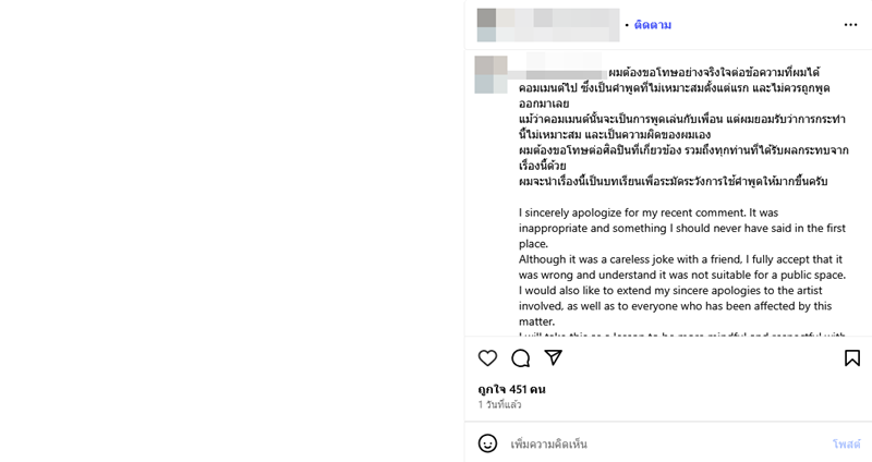 ผมต้องขอโทษต่อศิลปินที่เกี่ยวข้อง รวมถึงทุก ท่านที่ได้รับผลกระทบจากเรื่องนี้ด้วย ผมจะนำเรื่องนี้เป็นบทเรียนเพื่อระมัดระวังการใช้คำพูดให้มากขึ้นครับ"