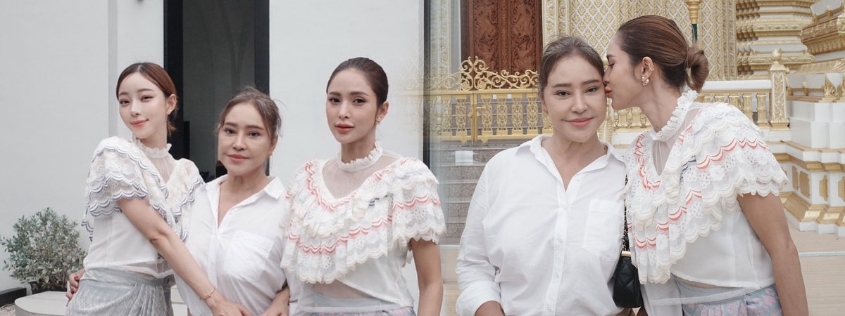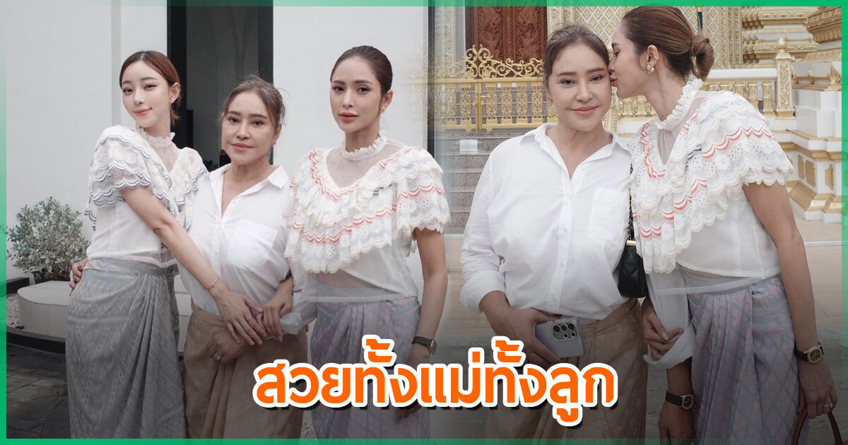 และในวันดี ๆ แบบนี้คุณแม่ม่วย และคุณลูกสาว อุ้ม - นิวเคลียร์ ก็ได้สวมชุดไทยมาอวดความสวยสง่า ซึ่งต้องบอกเลยว่ากินกันไม่ลง เป็นครอบครัวที่หน้าตาดีทั้งบ้านจริง ๆ