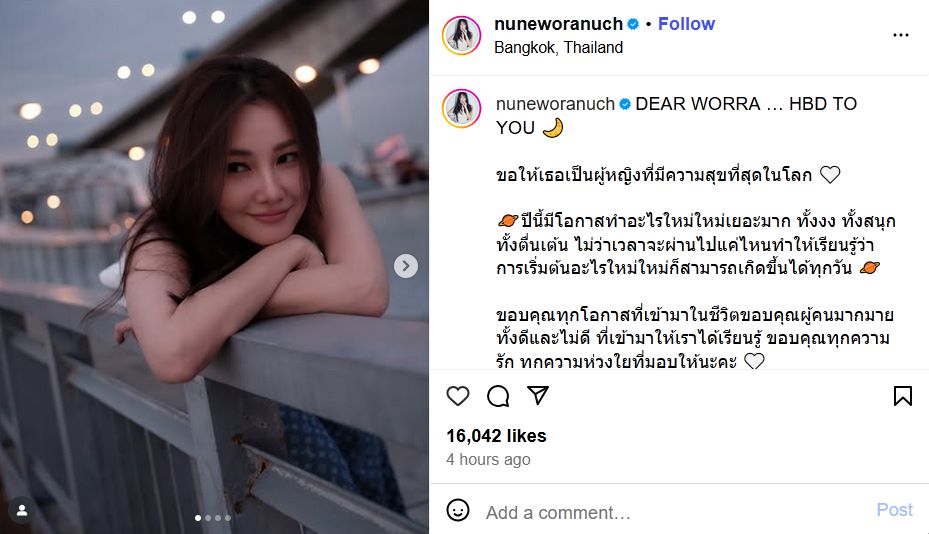 นักแสดงชื่อดัง นุ่น วรนุช โพสต์ข้อความลงอินสตาแกรมส่วนตัว @nuneworanuch เผยความรู้สึกซาบซึ้งในโอกาสอายุครบ 45 ปี โดยเธอบอกว่า "DEAR WORRA … HBD TO YOU 🌙 ขอให้เธอเป็นผู้หญิงที่มีความสุขที่สุดในโลก 🤍 🪐ปีนี้มีโอกาสทำอะไรใหม่ใหม่เยอะมาก ทั้งงง ทั้งสนุก ทั้งตื่นเต้น ไม่ว่าเวลาจะผ่านไปแค่ไหนทำให้เรียนรู้ว่า การเริ่มต้นอะไรใหม่ใหม่ก็สามารถเกิดขึ้นได้ทุกวัน 🪐 ขอบคุณทุกโอกาสที่เข้ามาในชีวิตขอบคุณผู้คนมากมาย ทั้งดีและไม่ดี ที่เข้ามาให้เราได้เรียนรู้ ขอบคุณทุกความรัก ทุกความห่วงใยที่มอบให้นะคะ 🤍"