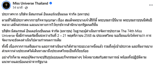 บริษัท มิสแกรนด์ อินเตอร์เนชั่นแนล จำกัด (มหาชน) ในฐานะผู้ดำเนินการจัดการประกวด The 74th Miss Universe ซึ่งมีกำหนดจัดขึ้นระหว่างวันที่ 2 - 21 พฤศจิกายน 2568 ณ ประเทศไทย ขอเรียนแจ้งให้ทราบว่า การจัดงานจะยังคงดำเนินไปตามกำหนดการเดิม