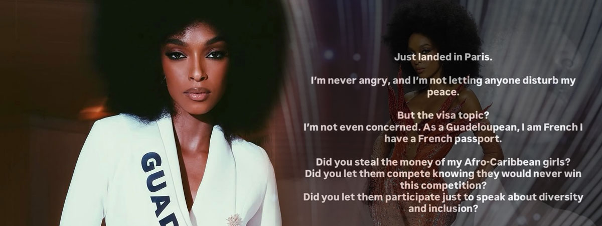 โดยมิสยูนิเวอร์สกวาเดอลูป กล่าวว่า "เพิ่งลงเครื่องถึงปารีส ฉันไม่เคยโกรธ และไม่ยอมให้ใครมาทำลายความสงบสุขของฉัน แต่เรื่องวีซ่าเนี่ยเหรอ ? ฉันไม่กังวลเลย ในฐานะชาวกัวเดอลูป ฉันเป็นพลเมืองของฝรั่งเศส ฉันมีหนังสือเดินทางฝรั่งเศส คุณขโมยเงินสาวแอฟโฟร-แคริบเบียนของฉันไปเหรอ ? คุณปล่อยให้พวกเธอเข้าแข่งขันทั้งที่รู้ว่าพวกเธอไม่มีทางชนะการแข่งขันนี้หรอกเหรอ ?
