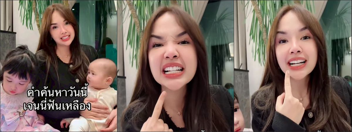 จากนั้นเจ้าตัวก็ชี้ที่ฟันพร้อมพูดต่อว่า "เห็นป่ะ คือทำวีเนียร์แค่ข้างบน ทำไมไม่ทำข้างล่าง วันนี้จะมาบอกเหตุผลกับทุกคน เพราะตอนฉันทำวีเนียร์ข้างบนเสร็จ มันต้องรอประมาณ 1 อาทิตย์ที่จะทำข้างล่าง แต่ฉันตรวจเจอก่อนว่าฉันท้องจาญ่า หมอก็เลยบอกถ้าท้องอ่อน ๆ ห้ามทำฟัน ต้องรอหลังคลอดน้องเสร็จ 3 เดือนค่อยมาทำ ตอนนี้จาญ่า 4 เดือนแล้ว นัดหมอแล้ว"