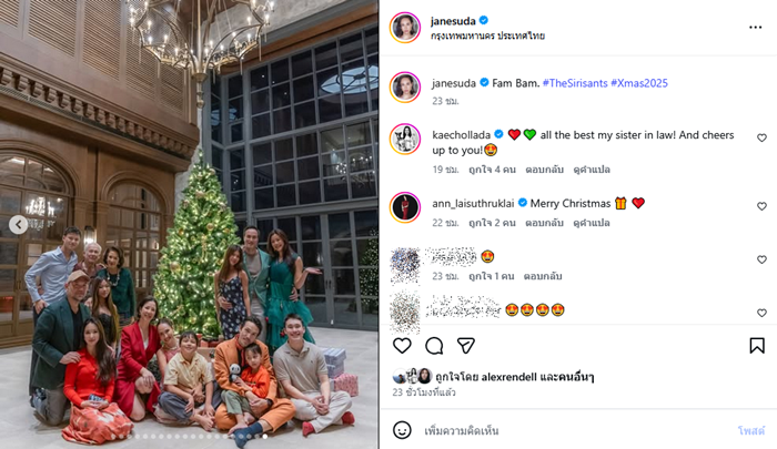 โดย เจนสุดา ได้เผยภาพโมเมนต์ครอบครัวใหญ่ ที่ฉลองปาร์ตี้อบอุ่นพร้อมหน้า มีการร่วมดินเนอร์ ร้องเพลง เล่นดนตรี และจับของขวัญกันอย่างสนุกสนาน ผ่านอิสตาแกรมส่วนตัว พร้อมแคปชั่นว่า "Fam Bam. #TheSirisants #Xmas2025"