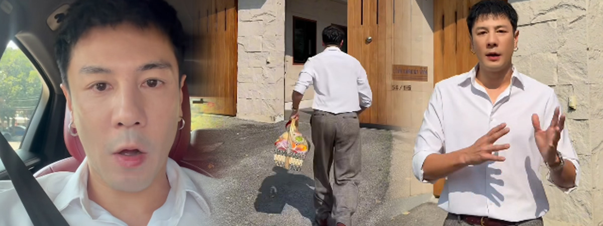 พร้อมโชว์ภาพถือกระเช้าที่นำมากราบขอโทษ เดินเข้าไปในที่ทำการพรรคไทยสร้างไทย ซึ่งก็ได้มีการแจ้งความประสงค์กับคนดูแลก่อนจะเข้าไปภายใน