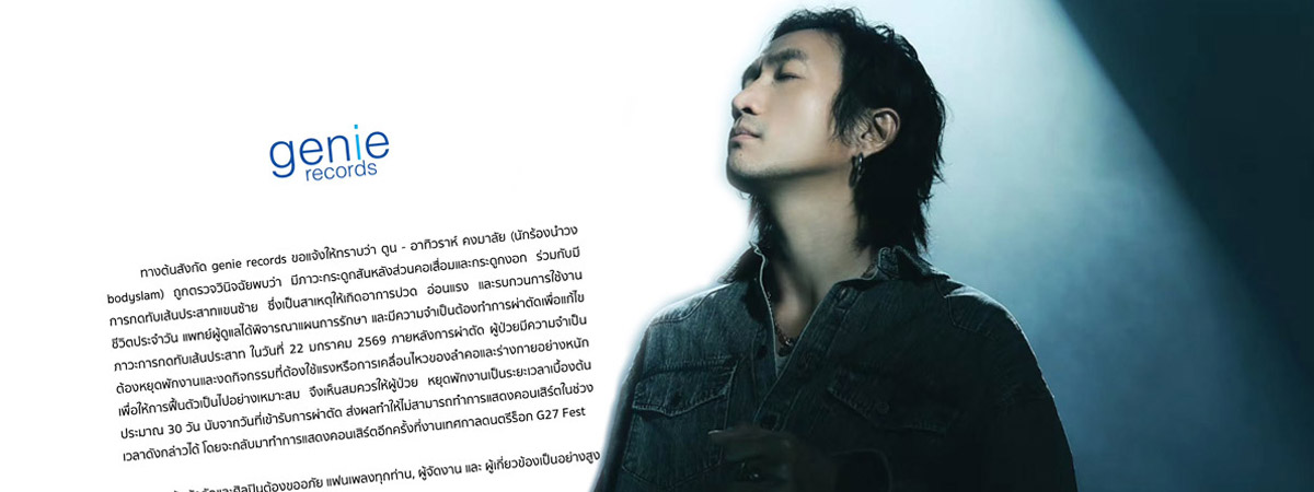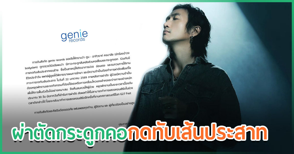 ขณะที่ ตูน บอดี้สแลม ก็ได้ออกมาโพสต์ข้อความก่อนเข้ารับการผ่าตัดว่า "เริ่มมีอาการอ่อนแรงที่นิ้วมือซ้ายและปวดต้นคอมาก ๆ ตั้งแต่ช่วงทัวร์คอนเสิร์ต 2-3 เดือนสุดท้ายของปีที่แล้ว แต่ก็ฝืนประคองเล่นคอนเสิร์ตประกอบกับดูอาการตัวเองแบบรายวันมาเรื่อย ๆ จนสุดท้ายอาการก็ไม่ดีขึ้นและเริ่มที่จะแย่ลงในทุก ๆ วัน