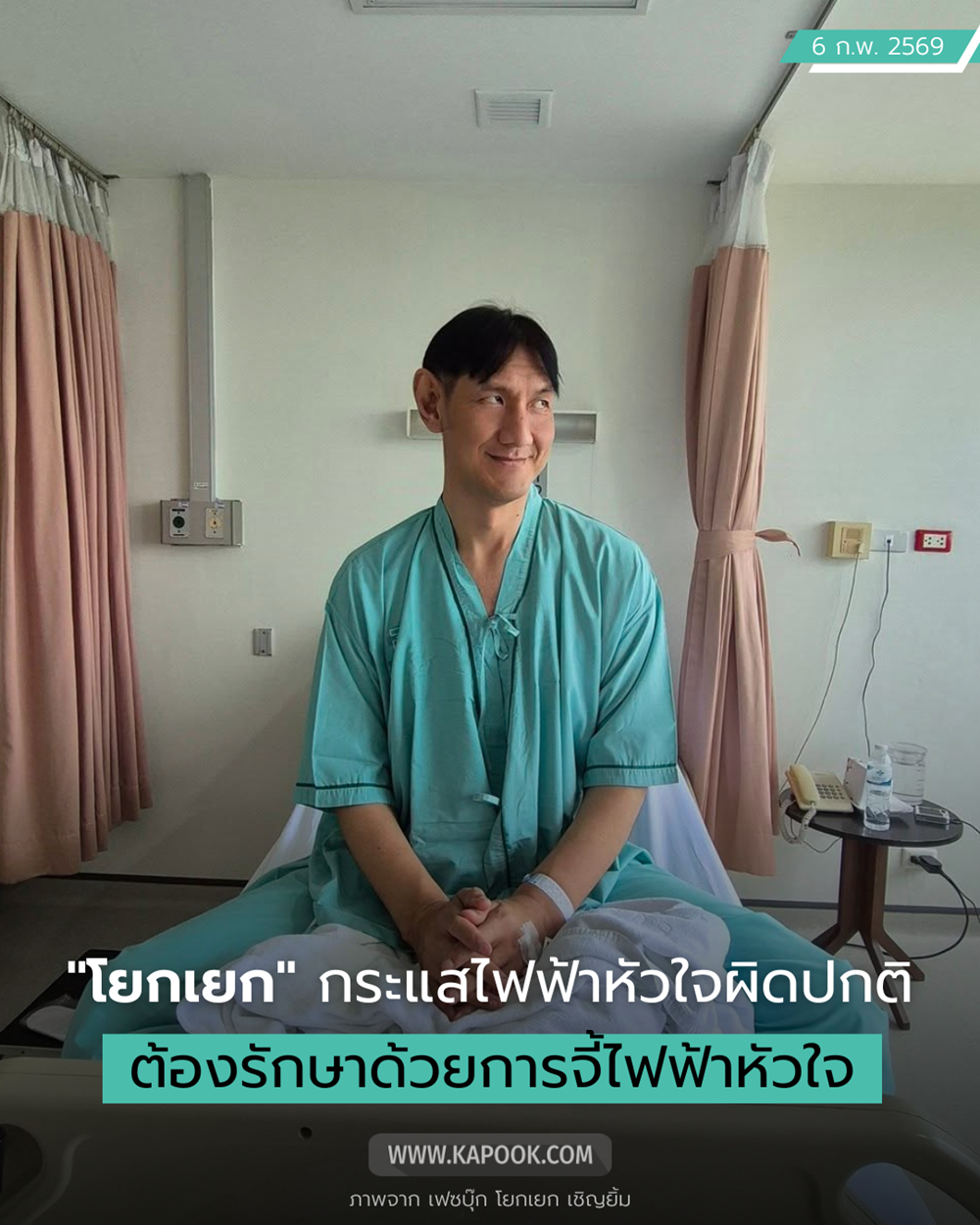 ทำเอาหลายคนเป็นห่วงกันไม่น้อย หลังจากดาราตลกคนดัง โยกเยก เชิญยิ้ม มีอาการป่วย หัวใจเต้นผิดจังหวะ ก่อนที่ล่าสุด (6 กุมภาพันธ์ 2569) เจ้าตัวจะออกมาโพสต์ภาพในชุดผู้ป่วย นั่งอยู่บนเตียงโรงพยาบาล พร้อมอัปเดตเกี่ยวกับอาการป่วยว่าเกิดจาก "กระแสไฟฟ้าหัวใจผิดปกติ" และต้องเข้ารับการรักษาด้วยการ "จี้ไฟฟ้าหัวใจ" โดยข้อความทั้งหมดมีดังนี้