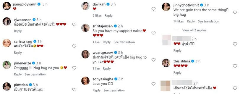 ด้านเพื่อน ๆ ที่อยู่ในวงการบันเทิง และผู้ที่ติดตามต่างพากันเข้าไปให้กำลังใจไฮโซแป้งเป็นจำนวนมาก โดยขอให้ติดตามจับคนร้ายมาได้สำเร็จ และได้ของมีค่าคืนกลับมาโดยเร็ว