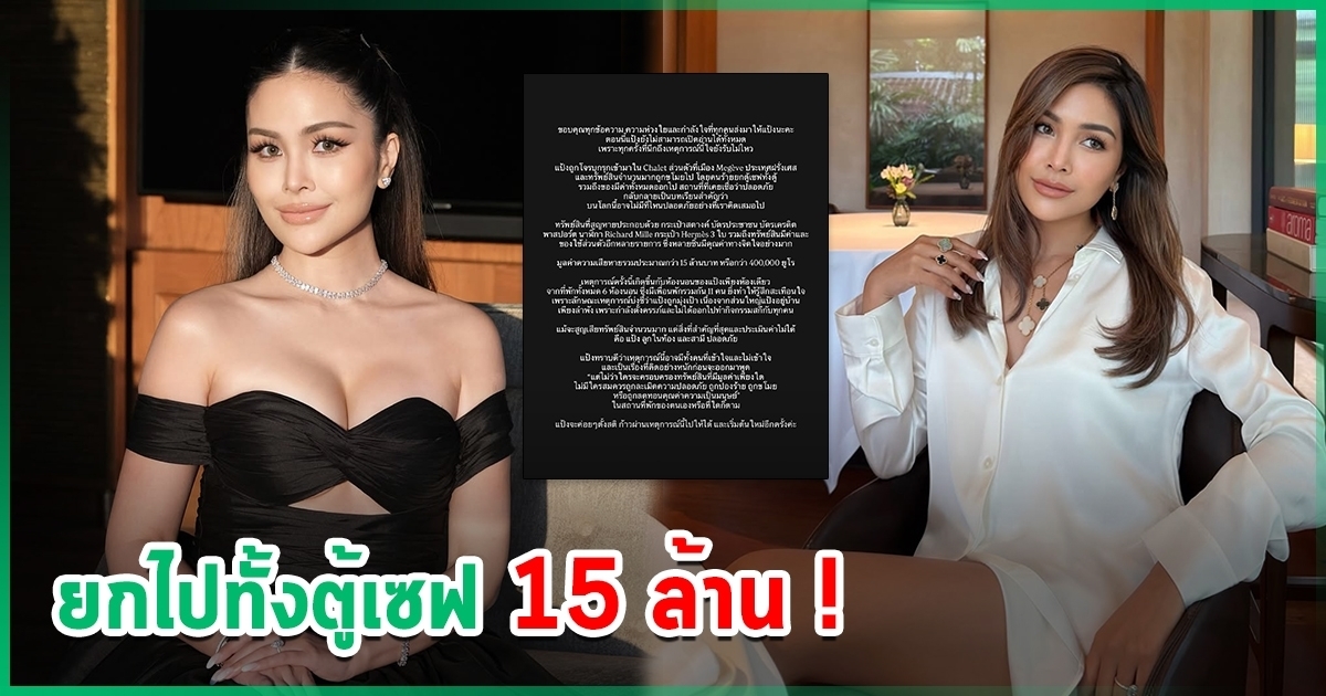 โดยไฮโซแป้ง ได้เล่าเรื่องราวเผยว่า โจรได้บุกรุกเข้ามาใน Chalet (บ้านพักตากอากาศ) ส่วนตัวของเธอที่เมือง Megève ประเทศฝรั่งเศส และขโมยทรัพย์สินไปจำนวนมาก โดยยกตู้เซฟไปทั้งตู้ ทรัพย์สินที่สูญหาย ได้แก่ กระเป๋าสตางค์ บัตรประชาชน บัตรเครดิต พาสปอร์ต นาฬิกา Richard Mille กระเป๋า Hermès 3 ใบ รวมถึงของใช้ส่วนตัว และทรัพย์สินที่มีคุณค่าทางจิตใจ รวมมูลค่าความเสียหายประมาณกว่า 15 ล้านบาท