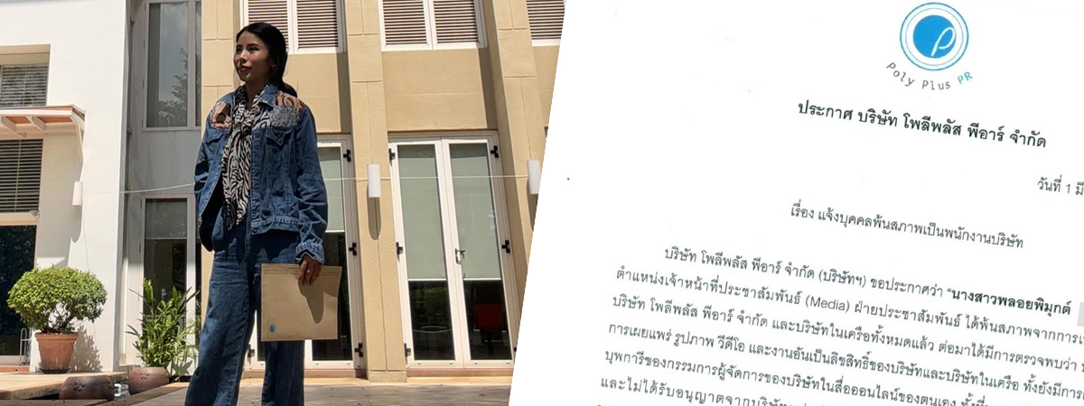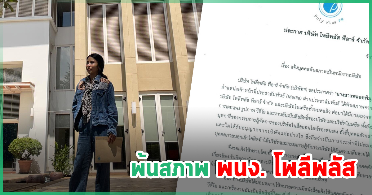 "บริษัท โพลีพลัส พีอาร์ จำกัด (บริษัท) ขอประกาศว่า นางสาวพลอยพิมุกต์ ……. (ไอส์) ตำแหน่งเจ้าหน้าที่ประชาสัมพันธ์ (Media) ฝ่ายประชาสัมพันธ์ ได้พ้นสภาพจากการเป็นพนักงานของบริษัท โพลีพลัส พีอาร์ จำกัด และบริษัทในเครือทั้งหมดแล้ว