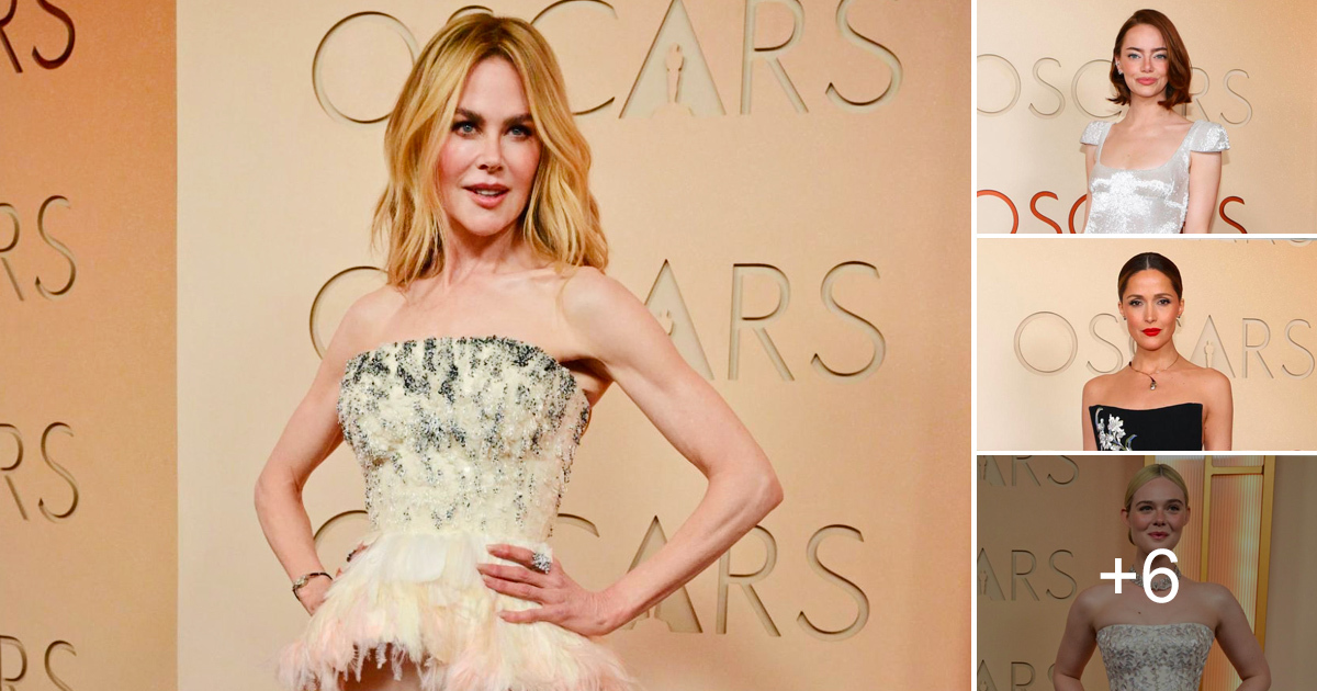 นิโคล คิดแมน ยังคงมาตรฐานเจ้าแม่พรมแดงในชุดราตรีเข้ารูปสีชมพูพาสเทล จาก Chanel ช่วงเอวเป็นดีเทล Peplum ที่ตกแต่งด้วยขนนกและงานปักเพชรระยิบระยับที่ตัวเสื้อ ชุดนี้ช่วยขับผิวและรูปร่างที่สมบูรณ์แบบของเธอให้โดดเด่น โดยเธอเลือกใส่เครื่องประดับเพียงน้อยชิ้นเพื่อเน้นความงามของชุด