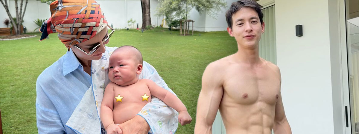 พร้อมกันนี้ เจ้าตัวยังได้เขียนแคปชั่นแซวว่า “ถอดเสื้อเก่ง ทั้งพ่อทั้งลูกเลย😂…. ตัวแน่นมากก..กินนมเก่งใช่ไม๊ลูกกก😊🤍 ”