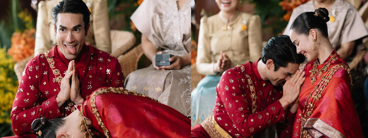 ส่วนช็อตที่พีคที่สุดคือ นาทีที่เจ้าสาวกราบเจ้าบ่าว ฝั่งเจ้าบ่าวก็แลบลิ้น ทำหน้าทะเล้นด้วยความยินดี