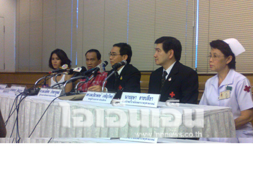 ศ.นพ.อดิศร ภัทราดูลย์ ผู้อำนวยการโรงพยาบาลจุฬาลงกรณ์, รศ.นพ.พีนพงศ์ เจริญวิทย์ รองผู้อำนวยการฝ่ายบริหาร, นางอุษา ราชปรีชา หัวหน้าพยาบาล พร้อมด้วย ต้อย - เศรษฐา และ อีฟ - พุทธิดา ศิระฉายา แถลงอาการของ นางอัญชลี ศิระฉายา หรือ อรัญญา นามวงศ์ ห้องประชุมชั้น 10 ตึก ส.ก. โรงพยาบาลจุฬาลงกรณ์ ซึ่งเข้ารับการรักษาด้วยอาการแขนซ้ายอ่อนแรง เมื่อคืนวันที่ 7 กันยายน