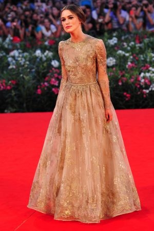 "เคียร่า ไนท์ลีย์" (Keira Knightley) ดาราสาวจากอังกฤษ มาในชุดสีเบจปักลายเลื่อมทอง ของ Valentino ชุดยาวกรอมเท้าแต่ไม่ดูหนักเกินไปด้วยท่อนบนเล่นลายซีทรูดูโปร่งตา พร้อมความหรูหราจากเลื่อมทอง