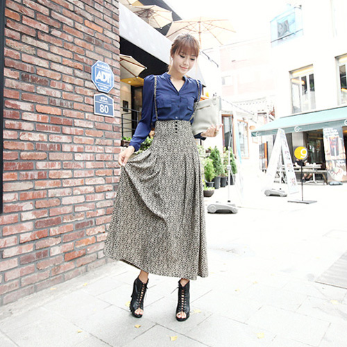 สาม เมื่อใส่กระโปรงแม็กซี่ลายปรินต์เวลากลางวัน ก็ควรใส่คู่กับรองเท้าส้นเตารีดพันข้อเท้า แต่เมื่อต้องการใส่ออกงานยามกลางคืน ก็สามารถใส่คู่กับรองเท้ารูปแบบเดียวกันหรือส้นสูงก็ได้ แต่ให้เปลี่ยนเป็นสีเมทัลลิกแทน ที่มา