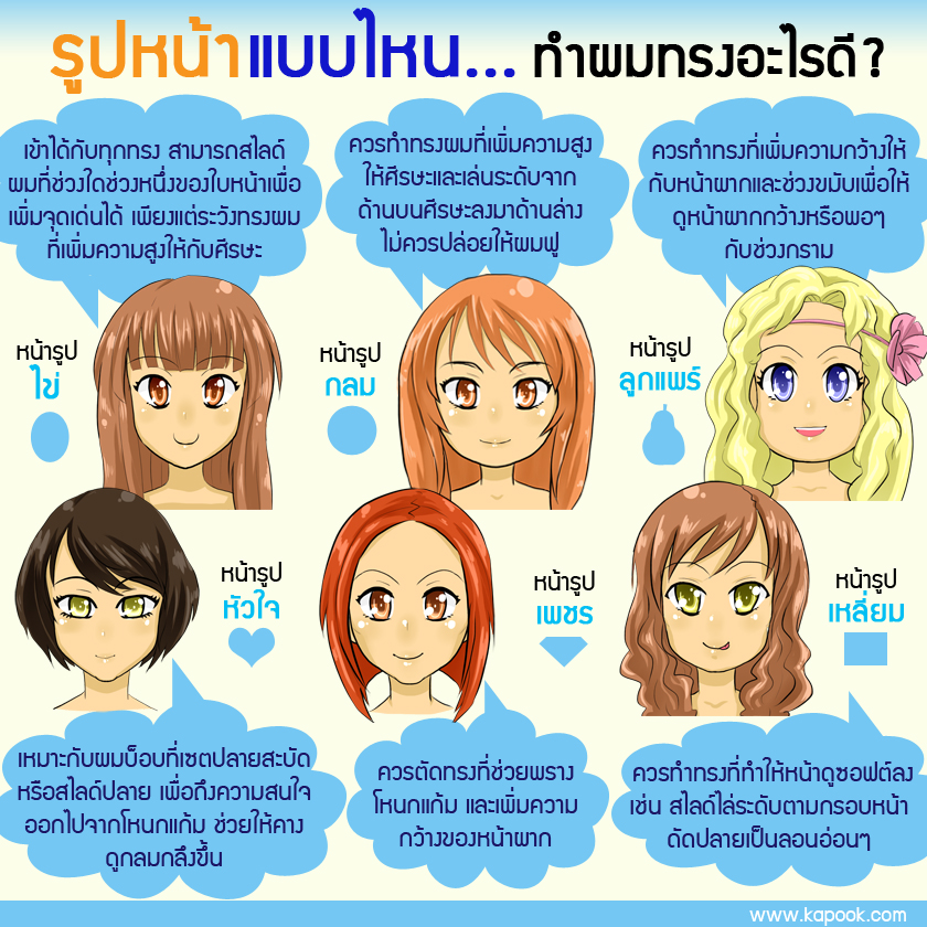 พอจะรู้แนวทางการจับคู่ทรงผมที่เหมาะกับใบหน้าแล้ว ไปร้านตัดผมครั้งหน้าก็อย่าลืมเลือกทรงผมโดยพิจารณารูปหน้าของตัวเองประกอบด้วยนะคะ รับรองว่าเปลี่ยนทรงคราวนี้ดูดีแน่นอนค่ะ ^^