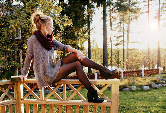 สาวสวยรายแรกรับแดดอุ่นยามบ่ายด้วยสเวตเตอร์สีเทาตัวใหญ่ ยาวคลุมสะโพก เพิ่มความอบอุ่นด้วยผ้าพันคอสีน้ำตาลอมแดง สต็อกกิ้งสีดำ และบูททรงแพลตฟอร์ม เรียบ ๆ ง่าย ๆ แต่จับมาแมทช์กันได้อย่างลงตัว