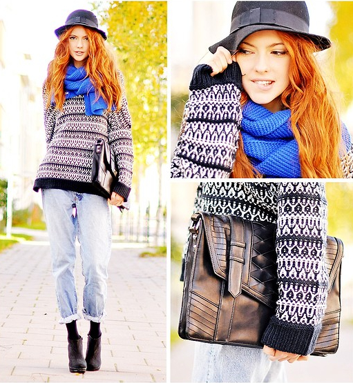 สาวหน้าหวานผมแดงรับความหนาวเย็น ด้วยสเวตเตอร์ถักลายละเอียดยิบสีขาวดำ ผ้าพันคอสีน้ำเงินสดดูคึกคัก และยีนส์ทรงตรงแบบที่หนุ่ม ๆ ใส่ แล้วพับขาขึ้นเหนือตาตุ่ม โชว์รองเท้าบูทดำสีแมทช์กับเสื้อและหมวกพอดี ^^