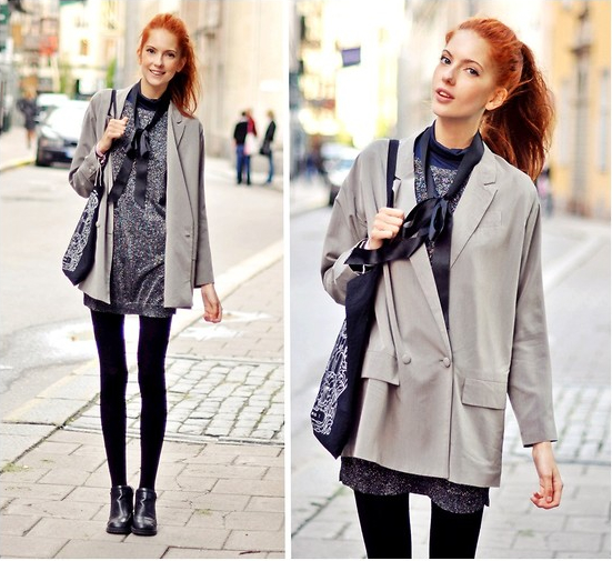 กลับมาที่สาวสวยผมแดงอีกครั้ง คราวนี้เธอโชว์ขาเรียวยาวภายใต้สต็อกกิ้งเนื้อหนาสีดำ โดยท่อนบนเป็นเดรสสีดำขาว หยิบริบบิ้นเส้นยาวมาผูกเป็นโบว์เพิ่มลูกเล่น ก่อนจะสวมแจ็กเก็ตสูทสีเทาทับ ดูเรียบแต่น่ารักดีทีเดียว