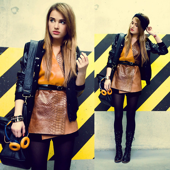 รับลมหนาวแบบสาวร็อกด้วยชุดลายหนังงูสีน้ำตาล-ส้มอมเหลือง แล้วทับด้วยแจ็กเก็ตหนัง สวมสต็อกกิ้งสีดำกับบูทตอกหมุดครึ่งแข้ง แบบนี้แหละทั้งเปรี้ยวและสวยเท่ในคราวเดียวกัน
