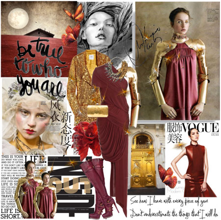 สุดชิคด้วยสีคอปเปอร์หรือทองแดง ที่จับคู่ลงตัวอย่างหรูหรากับสีแดงเบอร์กันดีจากเดรสเปิดไหล่เล่นระดับชายเสื้อที่ปล่อยด้านหนึ่งยาวพลิ้วตามจังหวะการเดิน และบูททรงสูงสีเดียวกัน จับคู่กับสีคอปเปอร์จากทักซิโดแจ็กเก็ตที่พราวระยับด้วยกากเพรชสีทอง แล้วแมทช์กับสร้อยและคลัทช์สีทอง ทั้งหรูทั้งเก๋ได้ในลุคเดียวกัน