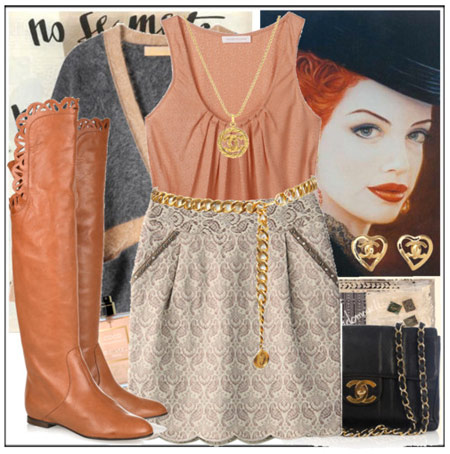 ลุควินเทจชิคแบบสาวหวาน กับเสื้อกล้ามสีชมพูเนื้อที่แมทช์มากับกระโปรงลายพิมพ์แบบคลาสสิค แถมด้วยเข็มขัดสายโซ่สีทอง ส่วนดาวเด่นเป็นบูทส้นเตี้ยสีน้ำตาล ที่ฉลุลายตรงขอบบูทใกล้หัวเข่า ดูเก๋หวานน่ารักจริง ๆ