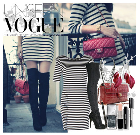 หยิดเดรสเข้ารูปลายทางขาวดำ มาแมทช์กับบูทส้นเข็มสีดำปักเลื่อมได้แบบเหมาะเจาะ จะแต่งหน้าแบบสโมกกี้อายสีดำอย่างสาวอีโม แล้วหิ้วกระเป๋าสีแดงให้ตัดกันก็เปรี้ยวสุด ๆ ไปเลย