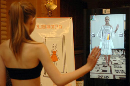แหล่งข่าวจากประเทศจีน อย่างเว็บไซต์โกไชน่า ระบุว่า เทคโนโลยี "กระจกลองเสื้อผ้า" หรือ "3D ฟิตติ้งรูม" ที่บริษัทเซินตงดิจิตัล ในเมืองหางโจว ประเทศจีนเพิ่งพัฒนาขึ้นมาโดยเฉพาะ โดยอาศัยการทำงานในระบบ "เซินตง อินเตอร์แอคทีฟ เวอร์ชวล" หรือการตอบสนองเสมือนจริง ทำให้นักช็อปทั้งหลายสามารถเพลิดเพลินกับการซื้อหาเสื้อผ้าชุดสวยได้ โดยไม่ต้องเสียเวลาเปลี่ยนถอดเพื่อลองเสื้อผ้าในห้องลอง เพราะเพียงแค่หมายตาเลือกเสื้อผ้าที่คุณสนใจเอาไว้ แล้วไปยืนเต็มตัวหน้ากระจก ชุดเสื้อผ้าที่มีในร้านก็จะปรากฏขึ้นมาทาบกับโครงร่างคุณในกระจกโดยอัตโนมัติ จากนั้นเพียงขยับมือไปทางซ้ายหรือขวาโดยไม่ต้องสัมผัสกระจก เพื่อเป็นการเลือกชุดเสื้อผ้าที่ต้องการลอง เท่านี้คุณก็จะได้ลองเสื้อผ้าชุดสวยที่ต้องการโดยไม่ต้องถอดเปลี่ยนเครื่องแต่งกายเดิมออกเลยแม้แต่น้อย และหากพอใจก็เพียงกดตกลง เลือกเสื้อผ้าชุดนั้นลงไปในตะกร้าช็อปปิ้งเสมือนจริง แล้วก็ไปชำระเงินที่เคาน์เตอร์ได้ทันที
