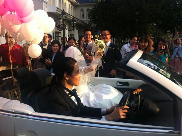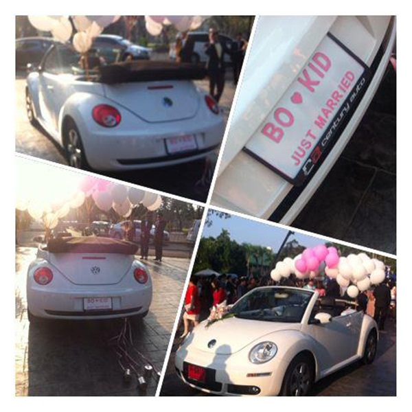 โดยบรรยากาศงานแต่งงานของเจ้าสาวป้ายแดงอย่าง โบ ทีเค นั้น เป็นไปด้วยรอยยิ้ม และความอบอุ่น และอบอวลไปด้วยความโรแมนติก สำหรับเจ้าสาวนั้น อยู่ในชุดราตรีกระโปรงยาว แขนยาว พร้อมผ้าคลุมผมเจ้าสาวประดับดอกไม้เล็ก ๆ ดูเรียบร้อย แต่หรูหรา ควงแขนคุณพ่อมายังตรงแท่นหน้าพิธี เพื่อมาพบเจ้าบ่าวที่อยู่ในชุดสูทสีดำ จากนั้นทั้งสองก็ได้สาบานรักต่อหน้าพระแท่น บาทหลวง และพระเจ้า ... หลังจากทำพิธีแต่งงานเสร็จ เจ้าบ่าวจูงมือเจ้าสาว นั่งรถบีทเทิลสีขาวป้ายแดงสุดหรู ที่ตกแต่งด้วยลูกโป่ง สีขาวและสีชมพู ขับออกไป ท่ามกลางเสียงโห่ร้องแสดงความยินดีของผู้ที่มาร่วมงาน