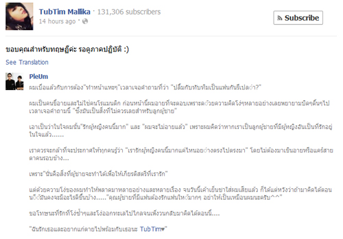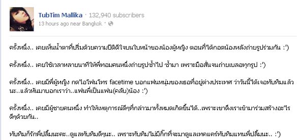 ล่าสุดเมื่อคืนวานนี้ (19 มีนาคม) สาวทับทิม ก็ได้ตอบความในใจ ผ่านเฟซบุ๊กส่วนตัว TubTim Mallika ว่า ...