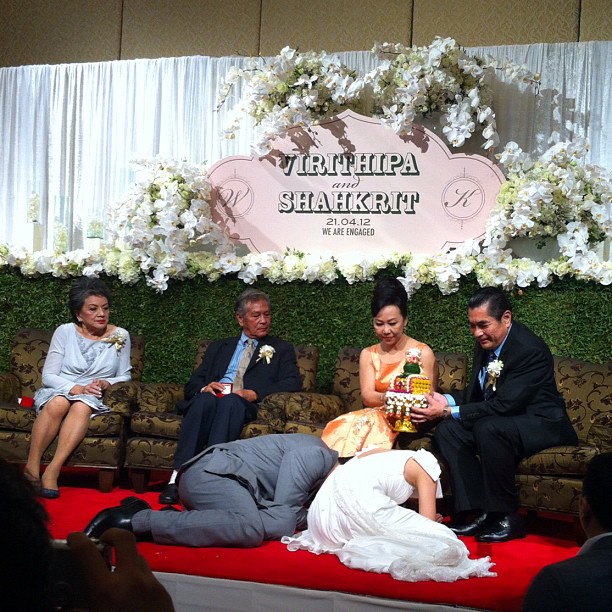 โดยฤกษ์ในตอนเช้าเป็นพิธีหมั้น และรดน้ำสังข์ พร้อมกันนี้ ทั้งคู่ก็ยังได้มีการจดทะเบียนสมรสเป็นที่เรียบร้อยแล้วด้วย ท่ามกลางบรรยากาศสุดชื่นมื่น โดยมีผู้ใหญ่ทั้ง 2 ฝ่าย ร่วมเป็นสักขีพยาน และยังมีเพื่อนดารา อาทิ นานา ไรบีนา , เมย์ พิชญ์นาฏ, พอลล่า เทเลอร์, แป้ง อรจิรา พิตต้า ณ พัทลุง, แก๊งเป็นต่อ ฯลฯ มาร่วมแสดงความยินดี