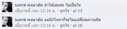 ล่าสุด ตั๊ก บงกช ออกมายอมรับว่า ตนเป็นคนโพสต์ข้อความดังกล่าวเอง โดยโพสต์เอาไว้ในหน้าเฟซบุ๊ก ของผู้ใช้งานที่ชื่อว่า "สหายน้อย ชื่อที่คนทั้งซอยรุมรังแก" ซึ่งเป็นการโพสต์เนื่องจากคนที่ตนรักและเคารพถูกดูหมิ่น ส่วนเรื่องอื่น ๆ ตนไม่ขอเอ่ยถึงแต่อย่างใด