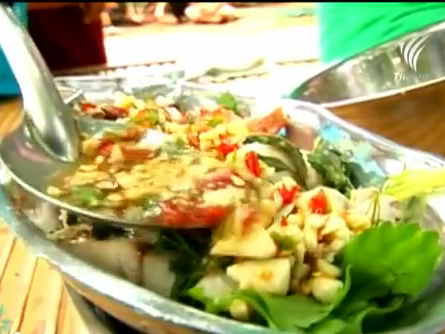 2. ปรุงรสน้ำจิ้มด้วย มะนาว น้ำปลา น้ำตาลทราย พริกขี้หนู และกระเทียม