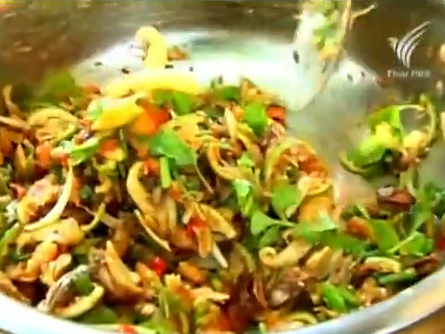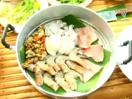 1. นำอาหารทะเลต่าง ๆ ลงไปนึ่งในซึ้ง นำเอากะเพรา ผักชี รากผักชี โรยหน้าให้ทั่วก่อนนึ่ง