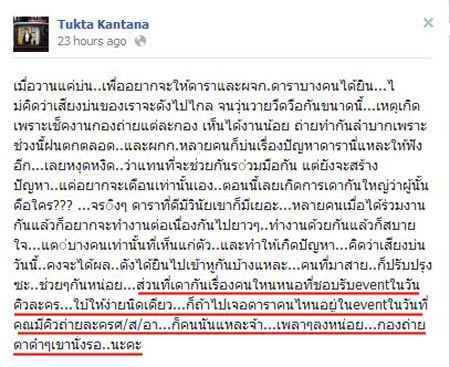 กลายเป็นข่าวครึกโครมพอสมควร เมื่อเจ้าแม่กันตนาอย่าง ตุ๊กตา จิตรลดา ดิษยนันทน์ เกิดอาการฉุนขาด โพสต์ข้อความระบายความในใจเกี่ยวกับดารานิรนามคนหนึ่ง ที่มีพฤติกรรมไม่เหมาะไม่ควร เอาเวลาถ่ายละครช่วงศุกร์ เสาร์ อาทิตย์ ไปรับงานอีเว้นท์ จนทำให้กองถ่ายสะดุด ซึ่งเรื่องนี้ก่อให้เกิดกระแสวิพากษ์วิจารณ์กันในวงกว้าง พร้อมตั้งข้อสงสัยว่า ดาราที่ตุ๊กตา กันตนา กล่าวถึงนั้นคือใคร