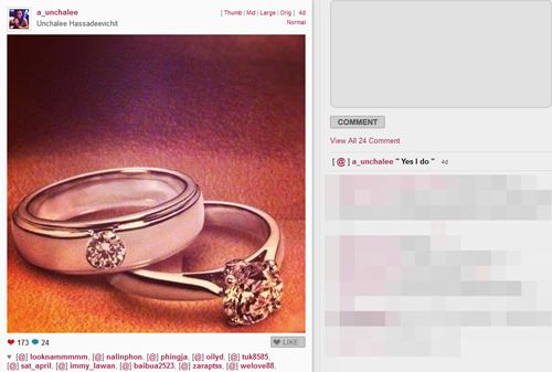 ส่วนในอินสตาแกรมนั้น มีเพื่อน ๆ และน้องสาว โย ยศวดี ได้เข้าไปแสดงความยินดีอย่างล้นหลาม ซึ่งเอ อัญชลี ได้บอกว่า ขอให้ทุกคนไปตัดชุดได้แล้ว และจะแจ้งข่าวดีอีกครั้งหนึ่ง จนกระทั่งผู้สื่อข่าวโทรไปสอบถามเรื่องนี้ เอ ก็ได้ออกมาบอกว่า สาเหตุที่ตัดสินใจแต่งงานนั้น เป็นเพราะตนเองและแฟนหนุ่ม มด อยากจะมีครอบครัวด้วยกัน และอยากทำทุกอย่างให้ถูกต้อง