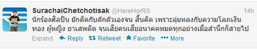 ทั้งนี้ เฮียฮ้อได้ทวีตข้อความในทวิตเตอร์ส่วนตัว @HereHorRS ว่า "นักร้องศิลปิน มักติดกับดักตัวเองจนสิ้นคิด เพราะลุ่มหลงกับความโลภเงินทอง ผู้หญิง ยาเสพติด จนเสียคนเสียอนาคต หมดทุกอย่างเมื่อสำนึกก็สายไป" ซึ่งมีคนที่ติดตามทวิตเตอร์ของเฮียฮ้อ รีทวีตข้อความนี้เป็นจำนวนมาก พร้อมทั้งถามไถ่ว่า นักร้องคนนั้นคือใคร แต่เฮียฮ้อก็ยังคงปิดปากเงียบ ไม่ยอมเฉลยปริศนาดังกล่าว