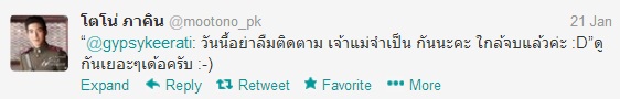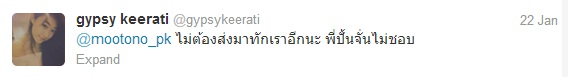 ไม่รู้ว่าเกิดอะไรขึ้นกับนักแสดงร่วมค่ายอย่าง สาวยิปซี คีรติ มหาพฤกษ์ กับหนุ่มโตโน่ ภาคิน ที่ล่าสุด เมื่อวันที่ 22 มกราคม ที่ผ่านมา สาวยิปซี เมนชั่นหาหนุ่มโตโน่ ในทวิตเตอร์ ว่า "ไม่ต้องส่งมาทักเราอีกนะ พี่ปั้นจั่นไม่ชอบ" ทั้งที่ก่อนหน้านี้ โตโน่ ยังช่วยทวีตโปรโมตละคร เจ้าแม่จำเป็น ที่สาวยิปซี เป็นนางเอกอยู่เลย นอกจากนี้ ทั้งคู่ยังจะมีผลงานภาพยนตร์เรื่อง รักโง่ ๆ ด้วยกันอีกต่างหาก
