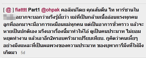 ทั้งนี้ เฟี๊ยต ได้โพสต์ข้อความลงในอินสตาแกรมส่วนตัวว่า "คอลัมน์โดย คุณไท ทาร์ซานใน... (หนังสือพิมพ์ฉบับหนึ่ง) อยากจะบอกว่า มึงรู้มั้ยว่า แม่ที่เป็นกล้ามเนื้ออ่อนแรงทุกคน ลูกที่ออกมาจะมีอาการเหมือนแม่ทุกคน แต่เป็นอาการชั่วคราว แล้วจะหายเป็นปกติเอง มึงเอาเรื่องนี้มาทำให้โอ๋ ดูเป็นคนประมาท ไม่ยอมหยุดทำงาน แล้วเอาอีก 2 ครอบครัวมาเปรียบเทียบ กูคิดว่าคนเหี้ย ๆ อย่างมึงแหละ ที่เป็นผลพวงของความประมาทของบุพการีมึงที่ให้มึงเกิดมา"