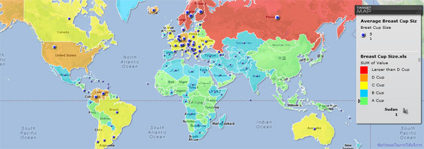 ขนาดหน้าอกของสาว ๆ จากประเทศต่าง ๆ ทั่วโลกยังคงเป็นประเด็นฮิตที่หยิบมาเม้าท์มอยกันเมื่อไหร่ก็ไม่มีเบื่อ แม้จะยังไม่เคยหาข้อสรุปได้จริง ๆ จัง ๆ ว่า สาว ๆ จากประเทศไหนมีอกอึ๋มสะบึมได้ใจมากที่สุด (เอ.. ฟังไปนี่น่าจะเป็นบทสนทนาในหมู่ผู้ชายมากกว่าผู้หญิงซะแล้วนะเนี่ย) ตอนนี้อาจได้ข้อสรุปที่ละเอียดถี่ยิบเลยล่ะว่าสาวสวยจากประเทศไหนจะอึ๋มได้ใจที่สุด กับแผนที่แสดงขนาดหน้าอกโดยเฉลี่ยของผู้หญิงแต่ละประเทศทั่วโลก