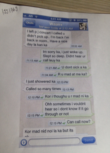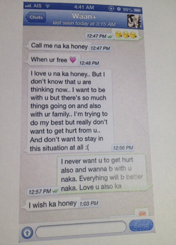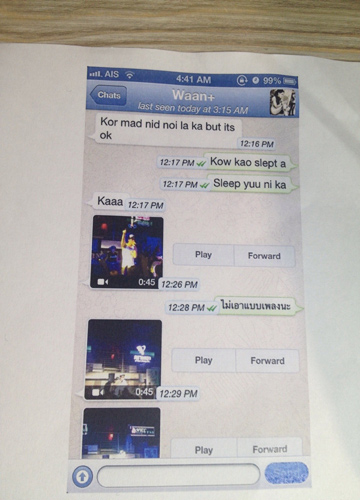หนิงกล่าวต่อว่า "หนิงมีหลักฐานทั้งข้อความที่ส่งมาหาจิน และโทรมาหาจินหลายสาย แต่จินไม่ได้รับ ส่งข้อความมาประมาณว่า ฉันไม่แคร์ที่คุณจะอยู่กับครอบครัว ฉันพอใจที่จะทำแบบนี้ นี่เหรอคะที่บอกว่าไม่รู้ว่าจินมีครอบครัวแล้ว ที่ออกมาวันนี้อยากให้ฝ่ายนั้นหยุด เพราะทุกวันนี้ในอินเทอร์เน็ตมีแต่คนรุมด่าหนิง ทั้งที่หนิงเงียบมาตลอด