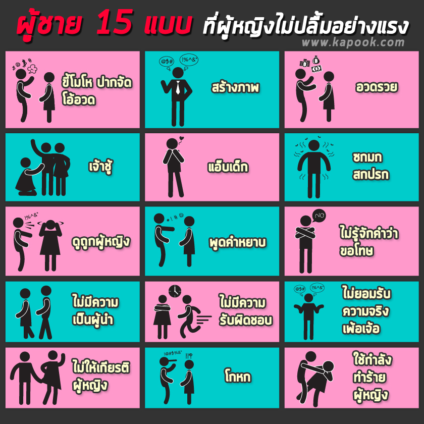เป็นอย่างไรบ้างตรงกับใจของสาว ๆ บ้างหรือเปล่าเอ่ย? เอ้า ! หนุ่มทั้งหลายพอได้รู้กันแล้วก็ลองสำรวจตัวเองดูนะว่าคุณเป็นผู้ชายประเภทที่สาว ๆ เขาไม่ชอบหรือเปล่าจ๊ะ