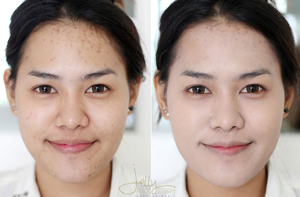 ขวา : ใช้คอนซีลเลอร์ Laura mercier Secret camouflage ผสมสีให้ตรงกับรองพื้น แล้วเก็บรายละเอียดอีกครั้งใครตามหาคอนซีลเลอร์กลบมิด ๆ ขอแนะนำนะคะ เนื้อแห้งไปนิดแต่ติดทนผสมสีได้ชอบมาก ๆ เสร็จแล้วเซตด้วยแป้งฝุ่น
