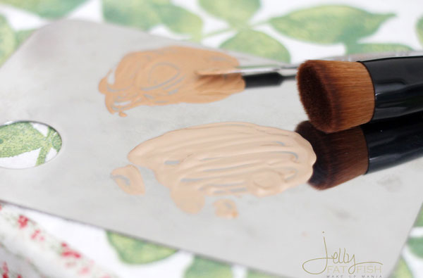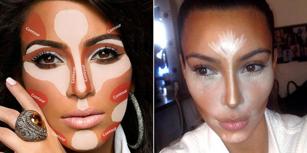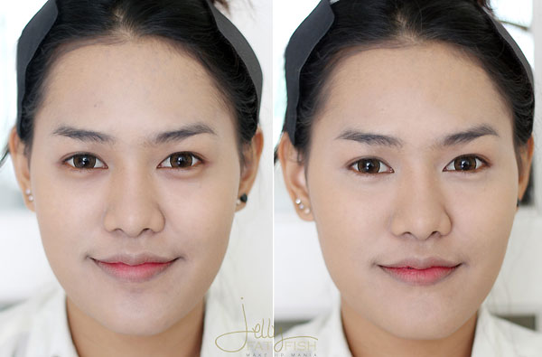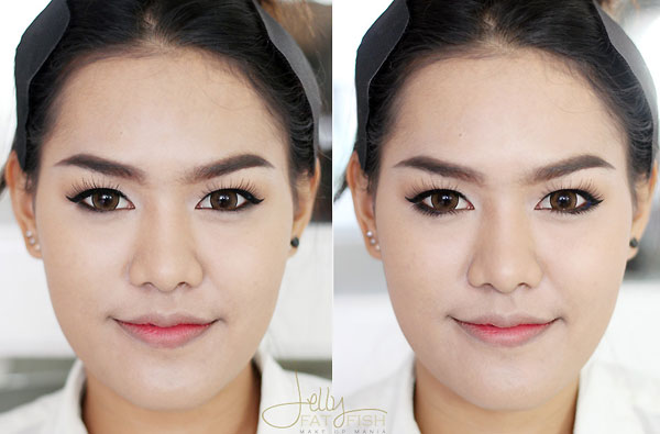 ซ้าย : หลังจากลงรองพื้นสีขาวกว่าใบหน้าแล้ว ก็ตามด้วยรองพื้นสีเข้มกว่าใบหน้าประมาณ 1-2 เฉดสี ลงที่กรอบหน้าและข้างจมูกเพื่อสร้างเงาและทำให้รูปหน้าดูสวยมากขึ้นค่ะ